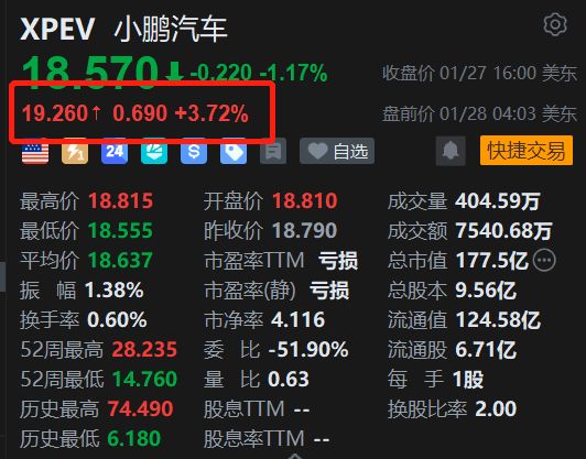 小鹏汽车(XPEV.US)盘前涨约4%报19.26美元。消息上,小鹏汽车副董事长兼联席总裁顾宏地在接受媒 体采访时表示,预计小鹏今年将实现"非常强劲"的增长。顾宏地称,海外市场的销售增长速度可能会超 过国内。此外据悉,小鹏汇天传出IPO动向。1月12日,据多家媒体消息,小鹏汇天已秘密向港交所提 交IPO申请,摩根大通、摩根士丹利两家投行被选为联席保荐人,上市进程有望最快于今年内完成。 | XPEV 小鹏汽车 | | | | --- | --- | --- | | 18 570 J -0.220 -1.17% | | 收盘价 01/27 16:00 美东 | | 19.260 + 0.690 +3.72% | | 盘前价 01/28 04:03 美东 | | 一 7 24 4 8 8 8 日 9 白 2 | | ● 快捷交易 | | 最高价 18.815 | 开盘价 18.810 | 成交量 404.59万 | | 最低价 18.555 | 昨收价 18.790 | 成交额 7540.68万 | | 平均价 18.637 | 市盈率TIM 亏损 | 总市值 177.5亿 (--) | | 振 幅 1.38% | ...