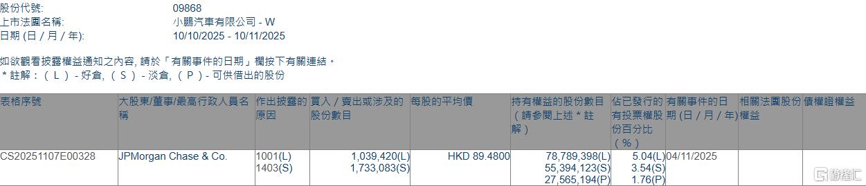 小鹏汽车-W(09868.HK)获摩根大通增持103.94万股