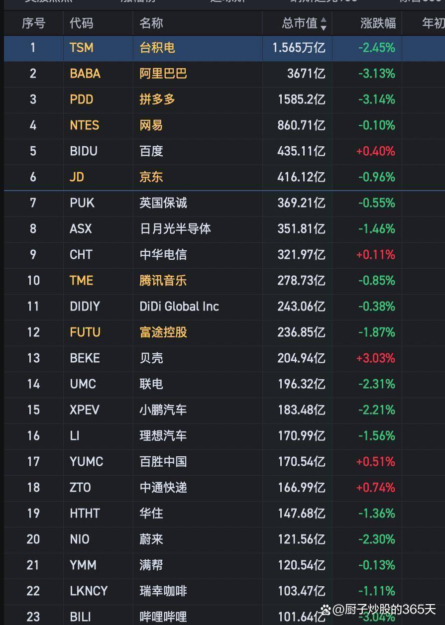 2025年12月11日的夜晚,美股市场悄然上演了一场资本大逃亡。 中概股集体跳水,阿里巴巴、拼多多纷纷破位下跌,连美股的七大科技巨头也难逃一劫。 这个夜晚,纳斯达克中国金龙指数收跌0.43%,35只中概股龙头集体沉没。 这场暴跌并非孤立事件,而是五重利空因素叠加下的必然结果。 科技"七巨头"的集体下跌为这场资本逃亡拉开了序幕。 英伟达暴跌3.29%,博通暴跌3.31%,特斯拉跌1.82%,苹果、谷歌、亚马逊和Meta Platforms全部收 跌。 只有传统行业的代表Visa逆势上涨2.88%,凸显出市场资金的防御性倾向。 中概股的表现更为惨淡。 阿里巴巴下跌3.13%,拼多多跌3.14%,哔哩哔哩跌3.04%,BOSS直聘跌幅高达4.53%。 新能源汽车板块全线受挫,小鹏汽车跌2.21%,理想汽车跌1.56%, 蔚来跌2.30%。 这种全面下跌的状况反映出资金在年末对高波动性资产的集体规避。 | 序号 | 代码 | 名称 | 总市值 - | 涨跌幅 年初 | | --- | --- | --- | --- | --- | | 1 | TSM | 台积电 | 1.565万亿 | -2.45% | | 2 | ...