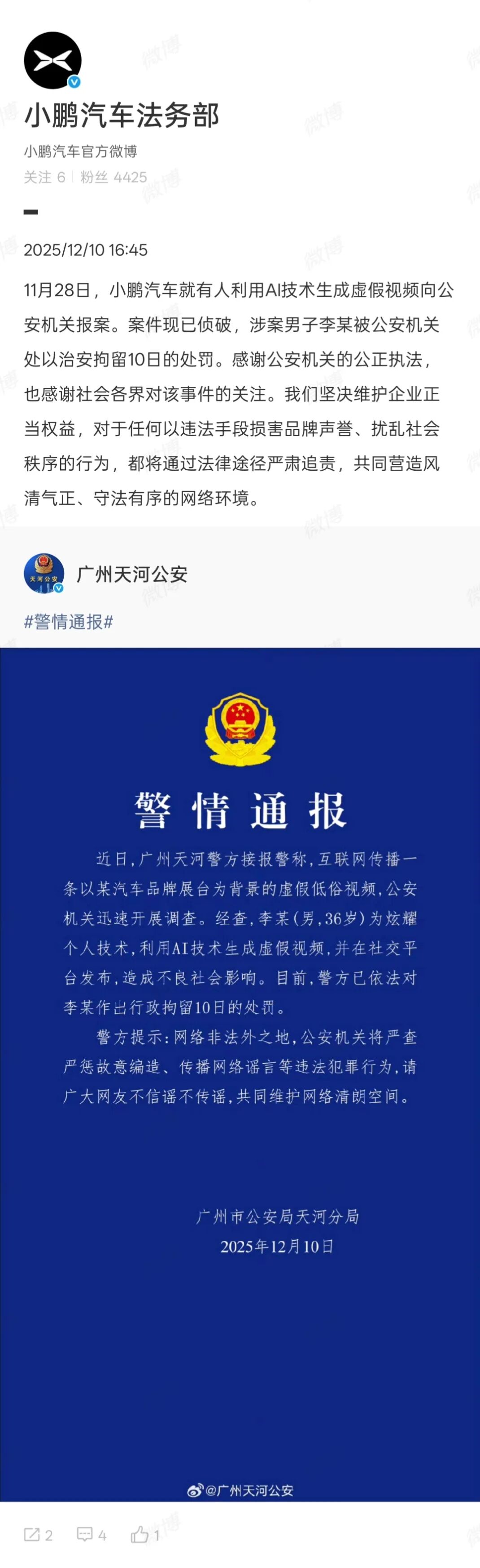 来源 | 红星新闻综合自@小鹏汽车法务部、广州天河公安 12月10日,广州天河公安发布警情通报: 近日,广州天河警方接报警称,互联网传播一条以某汽车品牌展台为背景的虚假低俗视频,公安机关迅 速开展调查。经查,李某(男,36岁)为炫耀个人技术,利用AI技术生成虚假视频,并在社交平台发布, 造成不良社会影响。目前,警方已依法对李某作出行政拘留10日的处罚。 警方提示:网络非法外之地,公安机关将严查严惩故意编造、传播网络谣言等违法犯罪行为,请广大网 友不信谣不传谣,共同维护网络清朗空间。 2025.12.10 本 文字数:799,阅读时长大约2分钟 小鹏汽车法务部同时发布消息: 11月28日,小鹏汽车就有人利用AI技术生成虚假视频向公安机关报案。案件现已侦破,涉案男子李某 被公安机关处以治安拘留10日的处罚。感谢公安机关的公正执法,也感谢社会各界对该事件的关注。我 们坚决维护企业正当权益,对于任何以违法手段损害品牌声誉、扰乱社会秩序的行为,都将通过法律途 径严肃追责,共同营造风清气正、守法有序的网络环境。 11月28日,小鹏汽车法务部在官微发文辟谣: 我司注意到部分账号在社交媒体及私域渠道,恶意传播利用 AI 技术 ...