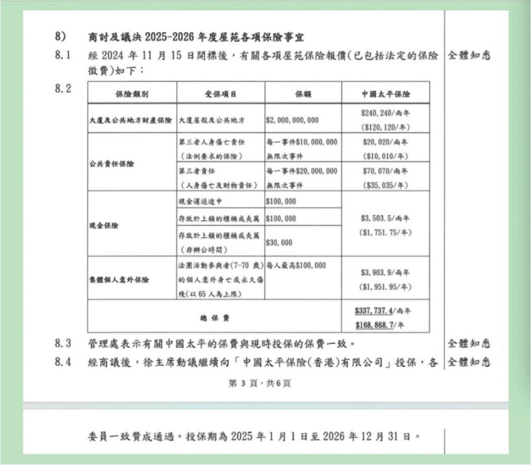12月3日下午,香港特区政府介绍大埔宏福苑火灾搜救安置等最新情况,截至当天14时,火灾已造成159人遇难。大火搜救工作持续进行,目前已完成了7 栋大楼的内部搜索。 这场香港近年来最严重的高层住宅火灾,不仅牵动社会神经,也触及了巨额保险理赔。宏福苑业主立案法团网站文件显示,该小区以33.77万港元/两年的 总保费投保了保额20亿港元的大厦财产险,太平香港作为主承保人,联合中再产险等再保险机构构建风险分担机制。 截至发稿前,太平香港已完成12户受灾居民家居保险的赔付工作,累计赔付金额727.2万港元,并承诺"应赔尽赔、能赔快赔"。据了解,太平香港承保了 宏福苑维修工程项目的建筑工程全险、建筑雇员赔偿保险,业主立案法团第三者责任险以及财产全险、公众责任险,并承保了部分住户的家居保险、家佣 险。 再保险机制在此次灾难中发挥关键作用,中国再保气候风险研究中心表示,一般而言,在再保险排分后,保险公司的实际净自留比例可能仅在10%甚至 5%左右,很大一部分损失将由再保险人承担,再保险机制能够发挥风险吸收与稳定市场的重要作用。 对香港大埔宏福苑火灾的救援和理赔持续受到各界关注。12月6日,香港特区政府房屋局发言人表示,考虑到 ...