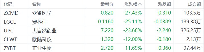 | 代码 | 名称 | 最新价 | 涨跌幅 ^ | 涨跌额 | 成交额 | | --- | --- | --- | --- | --- | --- | | ZCMD | 众巢医学 | 0.820 | -27.43% | -0.310 | 103.5万 | | LGCL | 周科任 | 0.1160 | -25.11% | -0.0389 | 189.38万 | | UPC | 大自然药业 | 7.220 | -23.68% | -2.240 | 326.25万 | | CLWT | 欧陆科仪 | 1.320 | -12.00% | -0.180 | 2.13万 | | ZYBT | 正业生物 | 2.720 | -11.69% | -0.360 | 97.44万 | 中概股收盘跌幅前五的个股为:众巢医学跌27.43%,罗科仕跌25.11%,大自然药业跌23.68%,欧陆科 仪跌12%,正业生物跌11.69%。(格隆汇) ...