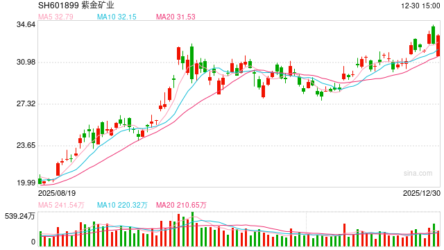 消息面上,12月30日,紫金矿业发布2025年业绩预告,预计全年实现归母净利润约510-520亿元,同比 增长约59%-62%,再创历史新高。2025年,公司主营产品持续放量,矿产金同比增长23.5%至90吨,矿 产铜同比增长2%至109万吨。公司指出,根据此次公告披露,其2026年产量仍将保持高速增长:矿产金 105吨、矿产铜120万吨、当量碳酸锂12万吨、矿产银520吨。这一目标如按期完成,矿产金产量将较原 计划提前两年突破百吨大关。 紫金矿业(601899)(02899)涨超3%,截至发稿,涨3.51%,报36.6港元,成交额6.42亿港元。 ...