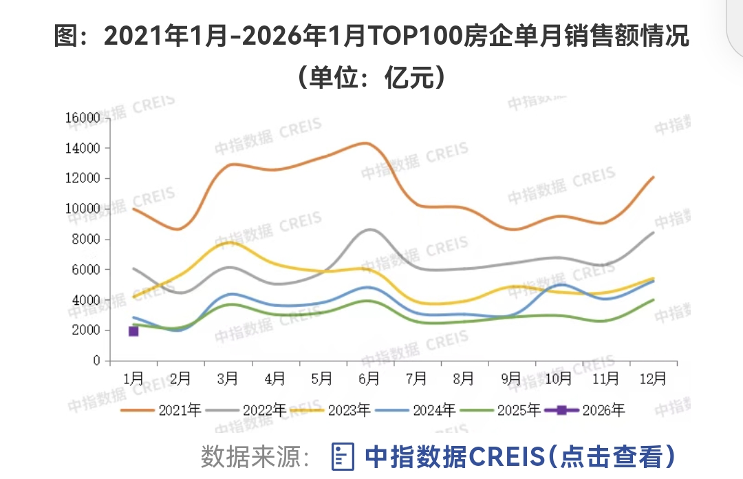 百强房企1月卖房"成绩单"出炉。 2026年开年,百强房企1月卖房"成绩单"出炉。 1月31日,中指研究院发布数据显示,2026年1月,TOP100房企销售总额为1905.2亿元,同比下降18.9%;同期,TOP100房企权益销售额为1321.4亿元。 房企销售金额前十依次为:保利发展、中海地产、华润置地、绿城中国、中旅投资、招商蛇口、中国金茂、建发房产、万科、滨江集团,其中仅保利、中 海、华润单月销售过百亿。 对比上年同期,房企销售位次已经发生了较大变化。头部房企中,保利、中海、华润、绿城的顺序未变,但万科从上年1月的第5位,下滑至今年1月的第9 位。中旅投资短期内成为"黑马",闯到今年1月房企全口径销售榜第5位。 TOP10随后的房企中,招商蛇口、建发房产、滨江集团变化不大、依然位列其中,但是华发股份从去年1月的第6位降至今年1月的第18位,同期中国铁建 从第10位降至第13位,中国金茂则从去年1月的第13位升至今年1月的第7位。 克而瑞数据显示,1月全国重点50城市新建商品住宅成交面积约810万平方米,表现较为清淡,新房市场整体进入淡季;同期,重点13城市二手房成交面积 约810万平方米,环比上升16% ...