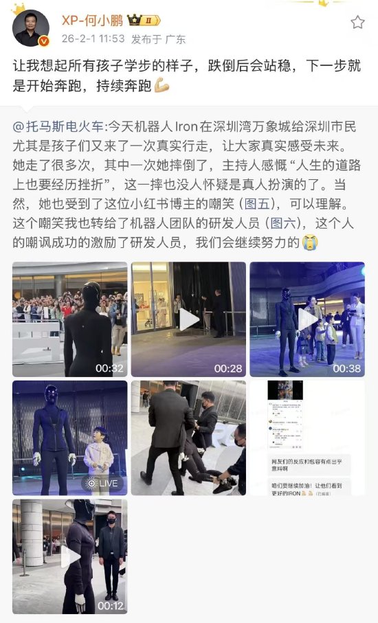 新浪科技讯 2月1日下午消息,近日,有网友在社交平台晒出小鹏IRON人形机器人摔倒照片。 小鹏汽车副总裁于涛通过微博账号"托马斯电火车"表示,机器人IRON在深圳湾万象城给深圳市民尤其 是孩子们又来了一次真实行走,让大家真实感受未来。她走了很多次,其中一次她摔倒了,主持人感 慨"人生的道路上也要经历挫折",这一摔也没人怀疑是真人扮演的了。 其后,小鹏汽车董事长、CEO何小鹏转发并表示:"让我想起所有孩子学步的样子,跌倒后会站稳,下 一步就是开始奔跑,持续奔跑"。 新浪科技讯 2月1日下午消息,近日,有网友在社交平台晒出小鹏IRON人形机器人摔倒照片。 小鹏汽车副总裁于涛通过微博账号"托马斯电火车"表示,机器人IRON在深圳湾万象城给深圳市民尤其 是孩子们又来了一次真实行走,让大家真实感受未来。她走了很多次,其中一次她摔倒了,主持人感 慨"人生的道路上也要经历挫折",这一摔也没人怀疑是真人扮演的了。 其后,小鹏汽车董事长、CEO何小鹏转发并表示:"让我想起所有孩子学步的样子,跌倒后会站稳,下 一步就是开始奔跑,持续奔跑"。 责任编辑:常福强 责任编辑:常福强 ...