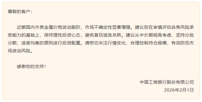 2月1日,工商银行通过"工银金行家"公众号发布《关于进一步做好贵金属市场风险防范的提示》。 提示称,近期国内外贵金属价格波动剧烈,市场不确定性显著增强。建议投资者在审慎评估自身风险承 受能力的基础上,保持理性投资心态,避免盲目追涨杀跌。建议从中长期视角考虑,坚持分批分散、适 度均衡的原则进行投资配置。请密切关注行情变化,合理控制持仓规模,有效防范市场波动风险。 ...