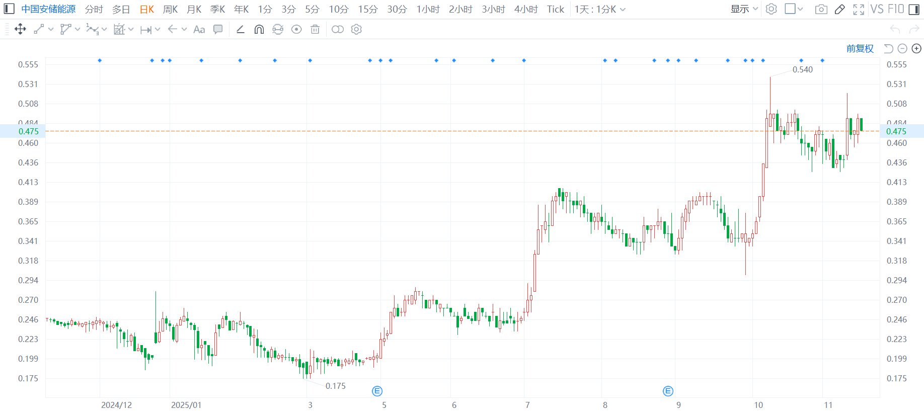 回购记录(近期) 1724.80万 0. 0. 862.40万 lo do l ■ 2025-10-27 2025-10-13 2025-11-11 公司回购股数 ■ 重要股东减持 ■ 收盘价 重要股东增持 中国安储能源(2399.HK)现跌3.06%报0.475港元,年内仍累涨超96%,最新市值14.47亿港元。消息面上,香港联交所数据显示,11月11日至14日,董事会主 席郭建新连续4个交易日减持中国安储能源股份,分别减持20万、100万、60万、30万股,金额分别为8.7万港元、47.82万港元、28.5万港元、13.95万港元。 (格隆汇) | 中国安储能源 | स्त्रम् स् | 多日 | 日K 周K 月K 季K 年K 1分 3分 5分 | | | | 10分 15分 30分 1小时 | 2小时 | 3小时 | 4小时 | | --- | --- | --- | --- | --- | --- | --- | --- | --- | --- | --- | | 1 | | P · * | | 5 UJ 7 | ◎ | ក | 0 @ | | | | | 0.555 | | | | | | | ...