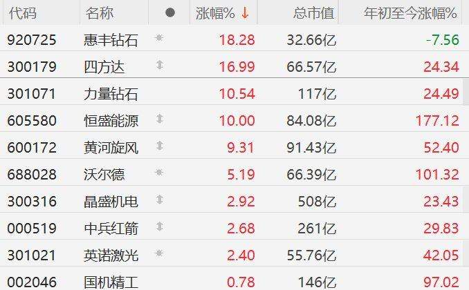 | 代码 | 名称 | . | 涨幅% ↓ | 总市值 | 年初至今涨幅% | | --- | --- | --- | --- | --- | --- | | 920725 | 惠丰钻石 | 家 | 18.28 | 32.66亿 | -7.56 | | 300179 | 四方达 | � | 16.99 | 66.57亿 | 24.34 | | 301071 | 力量钻石 | | 10.54 | 117亿 | 24.49 | | 605580 | 恒盛說源 | 中 | 10.00 | 84.08亿 | 177.12 | | 600172 | 黄河旋风 | # | 9.31 | 91.43亿 | 52.40 | | 688028 | 沃尔德 | 新 | 5.19 | 66.39亿 | 101.32 | | 300316 | 晶盛机电 | e | 2.92 | 508亿 | 23.43 | | 000519 | 中兵红箭 | 1 | 2.68 | 261亿 | 29.83 | | 301021 | 英诺激光 | | 2.40 | 55.76亿 | 42.05 | | 002046 | 国机精工 | | 0.78 | ...