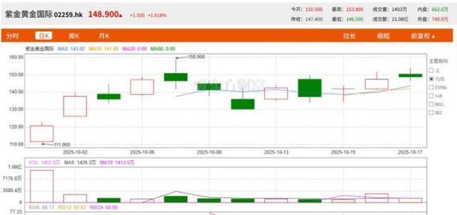 这一并购交易的完成恰逢黄金价格大幅上涨之际。自2025年年初以来,现货黄金价格屡创新高,至10月 17日,纽约金期货价格突破4360美元/盎司,伦敦金现货报价则达到4352.91美元/盎司,年内已创下超40 次新高。 金价上涨行情无疑对RG金矿的经济价值增添了新的看点。紫金矿业在公告中指出,RG金矿的并购将为 公司带来即时的产量和利润,且预期投资回报期较短,具有较高的经济效益。 然而,尽管短期内经济效益看好,长期价值的实现仍将取决于多方面因素,包括矿产资源的可持续开发 能力、全球经济走势以及环保等政策风险。 16天,纳入港股通 资本市场上,紫金矿业拆分的黄金板块已实现港交所上市。 9月30日上午,紫金黄金国际在香港联交所主板鸣锣上市,这是紫金矿业继2003年H股上市、2008年A股 上市后的第三次重大资本运作。 股价走势图。 来自东方财富 本报记者 张蓓 见习记者 黄指南 深圳报道 在当前黄金价格持续走高的背景下,紫金矿业正用大手笔收并购锁定未来成长空间。 10月12日晚,紫金矿业(601899.SH)与紫金黄金国际(02259.HK)联合发布公告,宣布紫金矿业控股 子公司紫金黄金国际已完成对哈萨克斯坦Ray ...