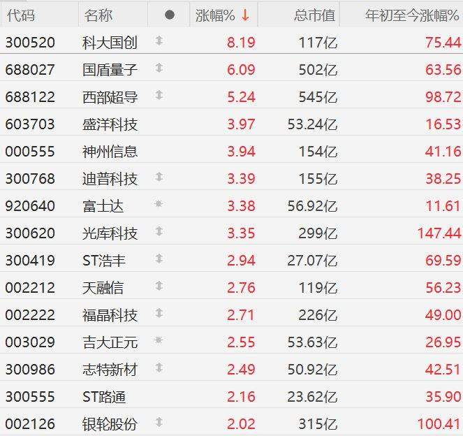 另外,据中研普华研究院预测,2025年全球量子科技市场规模将突破61亿美元,中国市场规模有望达到 115.6亿元,五年复合增长率超过30%。 国泰海通证券研报表示,量子计算已成为最具颠覆性的前沿技术之一,根据IBM和中国信通院报告来 看,量子计算目前还处于早期技术攻关阶段,预计未来5到10年有可能出现实质性进展。量子安全在应 用领域还处于起步阶段,但未来的发展空间很大。中国在QKD量子安全领域处于领先地位,已经形成 了以QKD技术为核心的较为完整的量子保密通信产业链。量子测量产业当前则已进入多元化发展周 期。 格隆汇10月29日|A股市场量子科技概念股继续集体走强,其中,科大国创涨超8%,国盾量子涨6%, 西部超导涨超5%,富士达、盛洋科技、神州信息、迪普科技、光库科技涨超3%。 | 代码 | 名称 | | 涨幅% ↓ | 总市值 | 年初至今涨幅% | | --- | --- | --- | --- | --- | --- | | 300520 | 科大国创 | 1 | 8.19 | 117亿 | 75.44 | | 688027 | 国盾量子 | 1 | 6.09 | 502亿 | 63.56 | | 6 ...