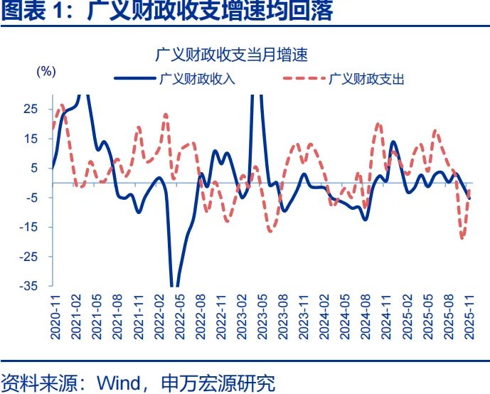 摘要 事件:12月17日,财政部公布2025年前11月财政收支情况。前11月,全国一般公共预算收入200516亿元,同比增长0.8%;全国一般公共预算支出 248538亿元,同比增长1.4%。 核心观点:后续财政收支重点或在保持赤字、规范税收、补充地方财力、化解隐债等方面 常规跟踪:广义财政收支分化,支出降幅大幅收窄,收入增速延续下滑 一般财政收入回落,拖累广义财政收入增速下滑。2025年11月广义财政收入同比-5.2%,较10月同比下降4.6个百分点;其中,政府性基金收入同 比- 15.8%,较10月降幅收窄2.6个百分点;一般财政收入同比-0.02%,较10月下降近3.2个百分点。从预算完成度看,2025年11月广义财政收入预 算完成7%,与2024年同期的7.1%以及过去五年平均的7%基本持平。 一般财政支出及政府性基金支出加快,推动广义财政支出降幅收窄。2025年11月,广义财政支出同比-1.7%,较10月降幅收窄17.5个百分点;一般 财政支出同比-3.7 %,较10月降幅收窄超6个百分点;政府性基金支出同比达2.8 %,较10月支出增速提升41个百分点。2025年11月广义财政支出预 算完成8%, ...