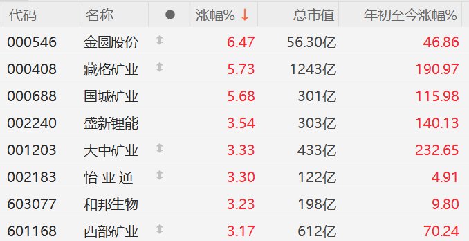 A股市场锂矿股拉升,其中,金圆股份(维权)涨超6%,藏格矿业、国城矿业(维权)涨超5%,盛新 锂能、大中矿业、西部矿业涨超3%。消息面上,碳酸锂主力合约日内大涨4%,现报111560元/吨。 | 代码 | 名称 | | 涨幅%↓ | 总市值 | 年初至今涨幅%。 | | --- | --- | --- | --- | --- | --- | | 000546 | 美国股份 | + | 6.47 | 56.30亿 | 46.86 | | 000408 | 藏格矿业 | + | 5.73 | 1243亿 | 190.97 | | 000688 | 国城矿业 | | 5.68 | 301亿 | 115.98 | | 002240 | 盛新锂能 | | 3.54 | 303亿 | 140.13 | | 001203 | 大中矿业 | 1 | 3.33 | 433亿 | 232.65 | | 002183 | 怡亚通 | 1 | 3.30 | 122亿 | 4.91 | | 603077 | 和邦生物 | | 3.23 | 198亿 | 9.80 | | 601168 | 西部矿业 | 1 | 3.17 | 612亿 ...