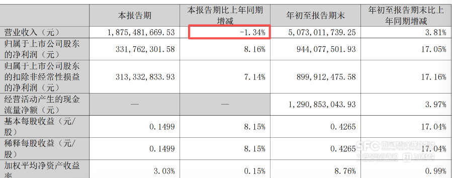 21世纪经济报道肖夏 这是新任董事长黄文胜6月接掌珠江啤酒后的第一个完整财报季度。 然而在上半年实现20%以上的盈利涨幅后,珠江啤酒第三季度明显降速,营收同比下滑1.34%,归母净利润同比涨幅亦回落至个位数。 | | 本报告期 | 本报告期比上年同期 | 年初至报告期末 | 年初至报告期末比上 | | --- | --- | --- | --- | --- | | | | 增减 | | 年同期增减 | | 营业收入(元) | 1.875.481.669.53 | -1. 34% | 5.073.011.739.25 | 3.81% | | 归属于上市公司股东 | 331,762,301,58 | 8.16% | 944.077.501.93 | 17.05% | | 的净利润(元) | | | | | | 归属于上市公司股东 的扣除非经常性损益 | 313.332.833.93 | 7.14% | 899. 912. 475. 58 | 17. 16% | | 的净利润(元) | | | | | | 经营活动产生的现金 | | | 1,290,853,043.93 | 3.97% | | 流量净额(元) | ...