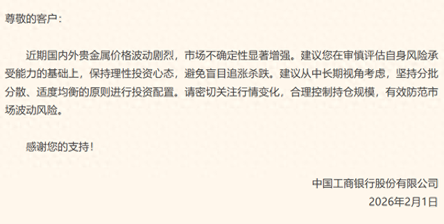 2月1日,中国工商银行股份有限公司发布《关于进一步做好贵金属市场风险防范的提示》: 尊敬的客户: 近期国内外贵金属价格波动剧烈,市场不确定性显著增强。建议您在审慎评估自身风险承受能力的基础 上,保持理性投资心态,避免盲目追涨杀跌。建议从中长期视角考虑,坚持分批分散、适度均衡的原则 进行投资配置。请密切关注行情变化,合理控制持仓规模,有效防范市场波动风险。 感谢您的支持! 中国工商银行股份有限公司 2026年2月1日 ...