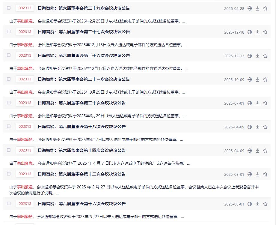 每经记者|胥帅 每经编辑|文多 2月27日晚间,日海智能(SZ002313)披露公告称,公司董事会于当日因"事出紧急"召开会议,授权副董事长代行总经理职责。 《每日经济新闻》记者梳理发现,自2025年2月以来,该公司已累计9次以"事出紧急"为由突击召开董事会、监事会,审议内容涵盖 关联交易、人事变更、资产处置等事项。更有个别会议是召开当天才递送会议材料。 | 图 | 002313 | 日海智能:第六届董事会第二十九次会议决议公告 | 2026-02-28 @ ↓ ☆ | | --- | --- | --- | --- | | | | 由于事出紧急, 会议通知等会议资料于2026年2月25日以专人送达或电子邮件的方式送达各位章事。 ... | | | 国 | 002313 | 日海智能:第六届董事会第二十七次会议决议公告 | 2025-12-18 0 4 8 | | | | 由于事出紧急, 会议通知等会议资料于2025年12月15日以专人送达或电子邮件的方式送达各位董事。... | | | ■ | 002313 | 日海智能:第六届董事会第二十六次会议决议公告 | 2025-12-13 @ & & | | | ...