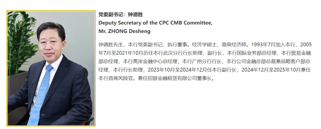 【导语】钟德胜因工作原因辞任招行首席风险官,仍在招行任职,副行长徐明杰获聘接任 招商银行(600036)领导钟德胜的任职发生变化,辞任首席风险官,仍在招行工作。1968年出生的副行长徐明杰,获聘首席风险官。 钟德胜在招商银行官网领导层排名仅次于董事长缪建民与行长王良,排名第三;辞任首席风险官前,官网显示的主要职务为党委副书记、首席风险官;最 新官网信息显示,钟德胜的职务为党委副书记。 10月31日晚间,招商银行发布公告称,公司董事会收到首席风险官钟德胜的辞任函。钟德胜因工作原因,向本公司董事会提请辞去首席风险官职务。钟德 胜先生的上述辞任自2025年10月31日起生效。公告表示,钟德胜将继续在招行及其控股子公司任职。 招行表示,公司董事会对钟德胜在担任首席风险官期间为本公司作出的贡献给予高度评价并致以衷心的感谢。 | 姓名 | 离任职务 | 离任时间 | 原定任期 | 离任原因 | 辞任生效后 | | 是否存在 未履行完 | | --- | --- | --- | --- | --- | --- | --- | --- | | | | | | | 是否继续在 | 具体 | | | | | | 到期日 | | ...