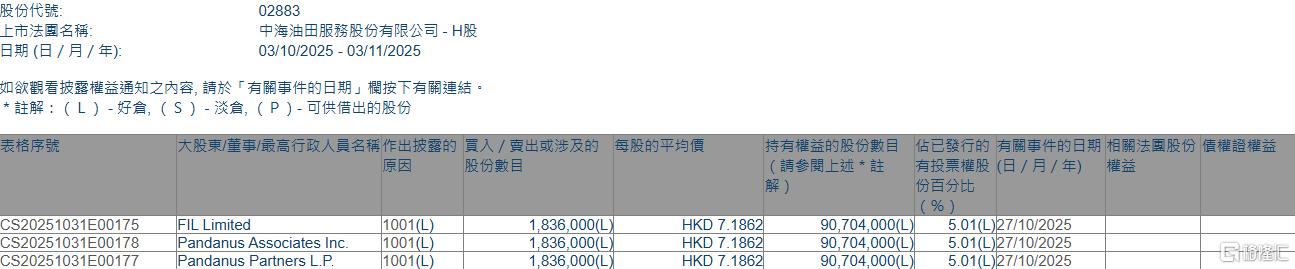 格隆汇11月3日丨根据联交所最新权益披露资料显示,2025年10月27日,中海油田服务(02883.HK)获FIL Limited在场内以每股均价7.1862港元增持183.6万 股,涉资约1319.39万港元。 | 豪格序號 | | 大股東/董事/最高行政人員名稱作出披露的 買入 / 曹出或涉及的 每般的平均價 | | | | 持有機器的股份數目 佔已發行的 有關事件的日期 | | --- | --- | --- | --- | --- | --- | --- | | | | | 股份剪辑 | | (語參閱上述*註 | 有投票權股 (日 / 月 / 年) | | | | | | | | 防自分成 | | | | | | | | 96 | | CS20251031E00175 | FIL Limited | 1001(L) | 1.836,000(L | HKD 7.1862 | 90.704.000(L | 5.01(L)27/10/2025 | | CS20251031E00178 | Pandanus Associates Inc. | 1001(L) | 1.836,000(L | HKD 7.186 ...