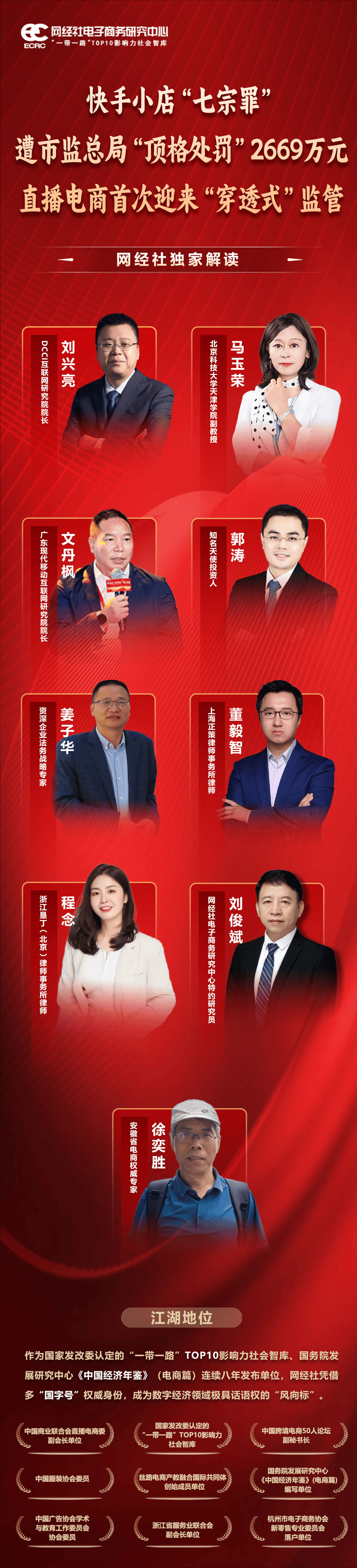 1月30日,市场监管总局在新闻发布会上公布了第五批直播电商领域典型案例,快手全资子公司成都快购科技有限公司因七项违法行为被罚没2669万 元。成都快购成立于2019年,是短视频平台快手的全资子公司,主要负责快手电商业务"快手小店"。处罚决定的背后,反映出平台企业在快速增长期对 合规经营的忽视,以及监管部门对直播电商行业日益收紧的监管趋势。 此外,总局通过分批发布典型案例的形式,点名通报了一批由地方市场监管部门查处的企业,主要包括:对商家资质审核失职的私域直播平台"小鹅 通"运营方深圳小鹅网络技术有限公司(罚款36万元)、进行虚假宣传的带货主体山西老葛商贸有限公司(累计罚款560万元)等。这些举措共同释放了 监管部门聚焦直播电商乱象与数据不正当竞争、通过"穿透式"执法压实平台主体责任的明确信号。 对此,网经社电子商务研究中心独家策划并组织了9位专家,发布了《快手小店"七宗罪"遭市监总局"顶格处罚"2669万元 直播电商首次迎来"穿透式"监 管:网经社独家解读报告》(25页完整版)。 ERVITY THE THE SEE 中国商业联合会直播电商 中国跨境电商50人论坛 路" TOP10景 副令长审位 副秘书长 社 ...