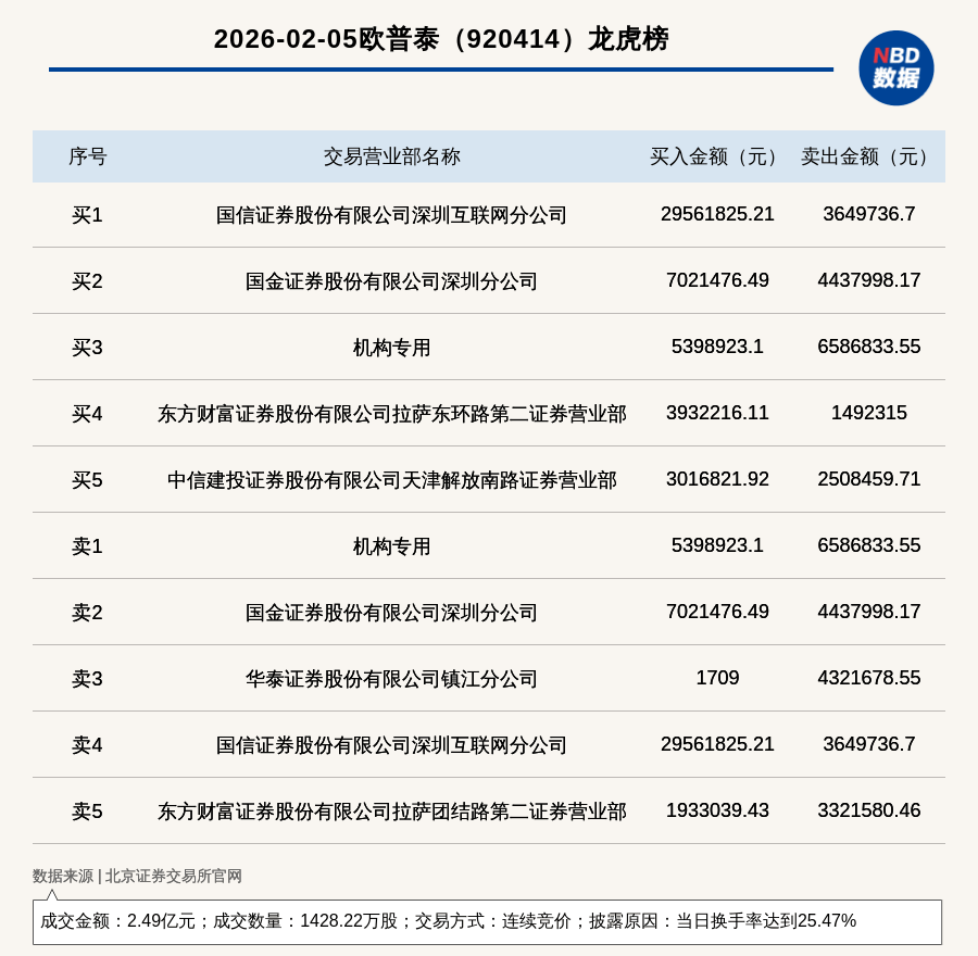 免责声明:本文内容与数据仅供参考,不构成投资建议,使用前核实。据此操作,风险自担。 每日经济新闻 (记者 张明双) 每经讯,2026年2月5日,北交所上市公司欧普泰(920414,收盘价:16.93元)登上龙虎榜,交易方式是连续竞价,披露原因是 当日换手率达到25.47%,成交数量1428.22万股,成交金额2.49亿元。买一席位为国信证券股份有限公司深圳互联网分公司,买 入2956.18万元;卖一席位为机构专用,卖出658.68万元。 | | 2026-02-05欧普泰 (920414) 龙虎榜 | | | | --- | --- | --- | --- | | 序号 | 交易营业部名称 | 买入金额(元) | 卖出金额(元) | | ਜੇਟ ਹ | 国信证券股份有限公司深圳互联网分公司 | 29561825.21 | 3649736.7 | | ਐੱਨ | 国金证券股份有限公司深圳分公司 | 7021476.49 | 4437998.17 | | 买3 | 机构专用 | 5398923.1 | 6586833.55 | | 买4 | 东方财富证券股份有限公司拉萨东环路第二证券营业部 | 3932216.1 ...