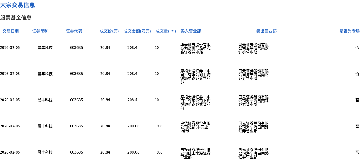 | 交易日期 | 证券简称 | 证券代码 | | | 成交价(元) 成交金额(万元) 成交量(*) 买入营业部 | | | 卖出营业部 | | --- | --- | --- | --- | --- | --- | --- | --- | --- | | 2026-02-05 | 晨丰科技 | 603685 | 20.84 | 208.4 | 10 | 公司深圳后渡中心 | 圆 | 【量限 | | 2026-02-05 | 晨丰科技 | ୧୦૩୧૪૨ | 20.84 | 208.4 | 10 | 量。 章 | 當時 | | | 2026-02-05 | 晨丰科技 | 603685 | 20.84 | 208.4 | 10 | 上漫 国】有限公司 | 製 | | | 2026-02-05 | 晨丰科技 | 603682 | 20.84 | 200.06 | 9.6 | 中信业务校位有限 | 圆霜 | 堂 | | 2026-02-05 | 晨丰科技 | 603685 | 20.84 | 200.06 | 9.6 | 员 | 製品 | | 2月5日,晨丰科技大宗交易成交49.2万股,成交额1025.32万元,占当日 ...
