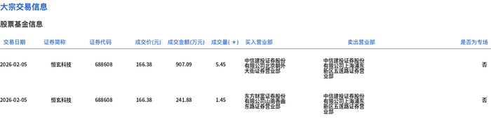 | 交易日期 | 证券简称 | 证券代码 | 成交价(元) 成交金额(万元) 成交量( *) 买入营业部 | | | | | 类出管业部 | 是否为专场 | | --- | --- | --- | --- | --- | --- | --- | --- | --- | --- | | 2026-02-05 | 恒玄科技 | 8098888 | 166.38 | 907.09 | 5.45 | 有限公司 上一篇 大街证券营业 | 中信建投资贸股份 सर एक | | Ka | | 2026-02-05 | 恒玄科技 | 688608 | 166.38 241.88 看餐 到出品餐饮 | | 1.45 | | 中信建投证券股份 | | Ka | 2月5日,恒玄科技大宗交易成交6.9万股,成交额1148.97万元,占当日总成交额的2.38%,成交价166.38 元,较市场收盘价208.99元折价20.39%。 ...
