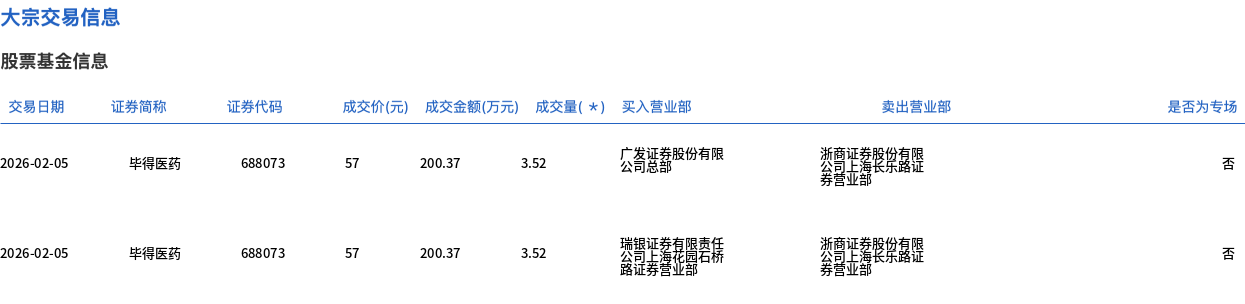 2月5日,毕得医药大宗交易成交7.04万股,成交额400.74万元,占当日总成交额的6.43%,成交价57元,较市场收盘价61.58元折价7.44%。 | 交易日期 | 证券简称 | 证券代码 | 成交价(元) | 成交金额(万元) 成交量( * ) 买入营业部 | | | 卖出营业部 | | --- | --- | --- | --- | --- | --- | --- | --- | | 2026-02-05 | 毕得医药 | 688073 | 57 | 200.37 | 3.52 | 广发证券股份有限 公司总部 | 为商证券股公复限 孝营业部 | | 2026-02-05 | 毕得医药 | 688073 | 57 | 瑞银正套有限营 200.37 | 3.52 | 路证券营业 | 为商证券股份直播 券营业部 | ...