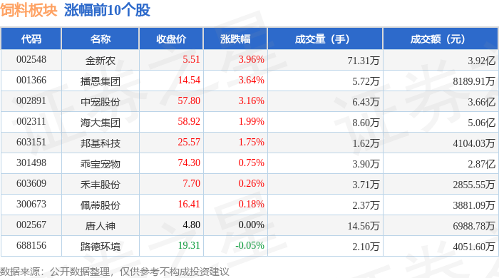 | 代码 | 名称 | 收盘价 | 涨跌幅 | 成交量(手) | 成交额(元) | | | --- | --- | --- | --- | --- | --- | --- | | 603668 | 天马科技 | 14.42 | -5.81% | 47.83万 | | 6.95 | | 920419 | 路斯股份 | 6181 | -1.41% | 8884.67 | | 1621.65万 | | 603363 | 傲农生物 | 5.22 | -1.32% | 59.78万 | | 3.14亿 | | 002696 | 百洋股份 | 7.01 | -0.99% | 11.81万 ﺏ | | 8224.15万 | | 002100 | 天康生物 | 7.38 | -0.94% | 24.86万 | | 1.84亿 | | 001313 | 都是與國 | 7.30 | -0.27% | 3.74万 | | 2720.84万 | | 000702 | 正虹科技 | 7.33 | -0.27% | 5.90万 | | 4315.24万 | | 002385 | 大北农 | 4.13 | -0.24% | 43.34万 ...