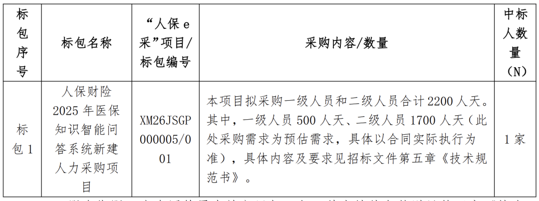 项目概况: | 标 包 | | "人保e | | 中标 人数 | | --- | --- | --- | --- | --- | | | 标包名称 | 采"项目/ | 采购内容/数量 | | | 序 | | 标包编号 | | 重 | | 파 | | | | (N) | | | 人保财险 2025 年医保 | XM26JSGP | 本项目拟采购一级人员和二级人员合计 2200人天。 其中,一级人员 500 人天、二级人员 1700 人天(此 | | | 标 | 知识智能问 | 000005/0 | 处采购需求为预估需求,具体以合同实际执行为 | 1 家 | | 包1 | 答系统新建 | 01 | 准),具体内容及要求见招标文件第五章《技术规 | | | | 人力采购项 | | 范书》。 | | | | 目 | | | | 中标候选人公示 2026 年 1 月 30 日发布中标候选人公示,云知声智能科技股份有限公司 2714000 元(中)。 项目概况: | 标 ব্র | | "人保e | | 中 标 人数 | | --- | --- | --- | --- | --- | | | 标包名称 | 采"项目/ | ...