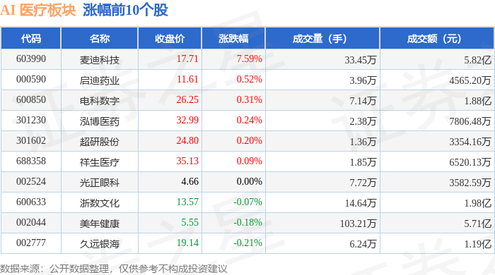 | 代码 | 名称 | 收盘价 | 涨跌幅 | 成交量(手) | 成交额(元) | | --- | --- | --- | --- | --- | --- | | 300253 | 卫宁健康 | 8.20 | -10.38% | 170.48万 | 14.28亿 | | 603716 | 塞力医疗 | 24.22 | -3.62% | 19.19万 | 4.66亿 | | 603108 | 润达医疗 | 16.15 | -3.18% | 22.26万 | 3.61亿 | | 688246 | 嘉和美康 | 24.89 | -2.81% | - 3.56万 | 8867.94万 | | 300078 | 思创 医患 | 3.57 | -2.72% | 35.02万 | 1.25 Z | | 000710 | 贝瑞基因 | 13.79 | -2.41% | 27.74万 | 3.85亿 | | 688393 | 安必平 | 25.35 | -2.01% | 1.84万 | 4678.39万 | | 000503 | 国新健康 | 10.07 | -1.85% | 12.95万 | 1.31亿 | | 300233 ...