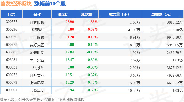 证券之星消息,11月6日首发经济板块较上一交易日下跌0.55%,米奥会展领跌。当日上证指数报收于 4007.76,上涨0.97%。深证成指报收于13452.42,上涨1.73%。首发经济板块个股涨跌见下表: | 代码 | 名称 | 收盘价 | 涨跌幅 | 成交量(手) | 成交额(元) | | --- | --- | --- | --- | --- | --- | | 300577 | 开润股份 | 23.90 | 1.83% | 1.60万 | 3815.32万 | | 300296 | 利亚德 | 6.80 | 0.59% | 47.06万 | 3.18亿 | | 600826 | 兰生股份 | 11.20 | 0.18% | 8.91万 | 9946.50万 | | 600778 | 友好集团 | 6.88 | -0.15% | 8.70万 | 5949.05万 | | 603587 | 地素时尚 | 12.84 | -0.16% | 1.92万 | 2462.79万 | | 603081 | 大丰实业 | 13.47 | -0.30% | 7.62万 | 1.03亿 | | 000031 | 大倪城 ...