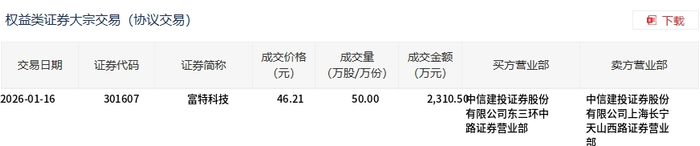 | 权益类证券大宗交易(协议交易) | | | | | | | 团 下载 | | --- | --- | --- | --- | --- | --- | --- | --- | | 交易日期 | 证券代码 | 证券简称 | 成交价格 (元) | 成交量 (万股/万份) | 成交金额 (万元) | 买方营业部 | 卖方营业部 | | 2026-01-16 | 301607 | 富特科技 | 46.21 | 50.00 | | 2,310.50中信建投证券股份 | 中信建投证券股份 | | | | | | | | 有限公司东三环中 | 有限公司上海长宁 | | | | | | | | 路班券营业部 | 天山西路证券营业 | | | | | | | | | 司 | 1月16日,富特科技大宗交易成交50万股,成交额2310.5万元,占当日总成交额的3.15%,成交价46.21 元,较市场收盘价47.64元折价3%。 ...