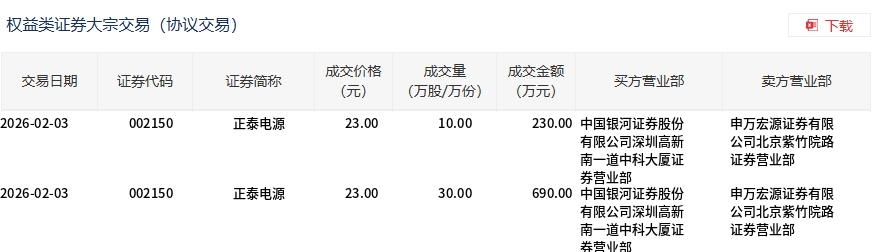 | 交易日期 | 证券代码 | 证券简称 | 成交价格 | 成交量 | 成交全额 | 买方营业部 | 卖方营业部 | | --- | --- | --- | --- | --- | --- | --- | --- | | | | | (元) | (万股/万份) | (万元) | | | | 2026-02-03 | 002150 | 正泰电源 | 23.00 | 10.00 | | 230.00 中国银河证券股份 | 申万宏源证券有限 | | | | | | | | 有限公司深圳高新 | 公司北京紫竹院路 | | | | | | | | 南一道中科大厦证 | 证券营业部 | | | | | | | | 券营业部 | | | 2026-02-03 | 002150 | 正泰电源 | 23.00 | 30.00 | | 690.00 中国银河证券股份 | 申万宏源证券有限 | | | | | | | | 有限公司深圳高新 | 公司北京繁竹院路 | | | | | | | | 南一道中科大厦证 | 证券营业部 | | | | | | | | 若营业部 | | 2月3日,正泰电源大宗交易成交40万股,成交额920万元 ...