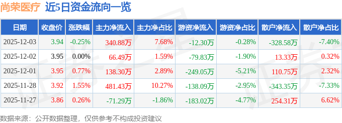 股票行情快报:尚荣医疗(002551)12月3日主力资金净买入340.88万元