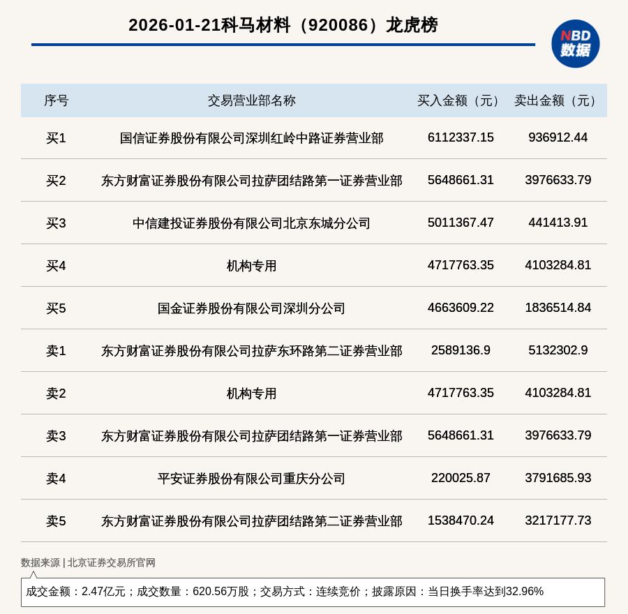 (记者 曾健辉) 免责声明:本文内容与数据仅供参考,不构成投资建议,使用前核实。据此操作,风险自担。 每经讯,2026年1月21日,北交所上市公司科马材料(920086,收盘价:40.47元)登上龙虎榜,交易方式是连续竞价,披露原因 是当日换手率达到32.96%,成交数量620.56万股,成交金额2.47亿元。买一席位为国信证券股份有限公司深圳红岭中路证券营业 部,买入611.23万元;卖一席位为东方财富证券股份有限公司拉萨东环路第二证券营业部,卖出513.23万元。 | | 2026-01-21科马材料 (920086) 龙虎榜 | | | | --- | --- | --- | --- | | 序号 | 交易营业部名称 | 买入金额(元) | 卖出金额(元) | | ਜੇ ਹ | 国信证券股份有限公司深圳红岭中路证券营业部 | 6112337.15 | 936912 44 | | 买2 | 东方财富证券股份有限公司拉萨团结路第一证券营业部 | 5648661.31 | 3976633.79 | | 址3 | 中信建投证券股份有限公司北京东城分公司 | 5011367.47 | 441413.91 | | ...