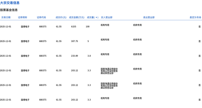 进一步统计,近3个月内该股累计发生2笔大宗交易,合计成交金额为1933.72万元。该股近5个交易日累 计上涨4.43%,主力资金合计净流入284.16万元。 责任编辑:小浪快报 第1笔成交价格为43.26元,成交40.00万股,成交金额1,730.40万元,溢价率为-12.23%,买方营业部为机 构专用,卖方营业部为兴业证券股份有限公司上海自由贸易试验区分公司。 第2笔成交价格为43.26元,成交4.70万股,成交金额203.32万元,溢价率为-12.23%,买方营业部为招商 证券股份有限公司深圳科技园高新南一道证券营业部,卖方营业部为兴业证券股份有限公司上海自由贸 易试验区分公司。 炒股就看金麒麟分析师研报,权威,专业,及时,全面,助您挖掘潜力主题机会! 12月1日,澄天伟业收涨3.68%,收盘价为49.29元,发生2笔大宗交易,合计成交量44.7万股,成交金额 1933.72万元。 ...