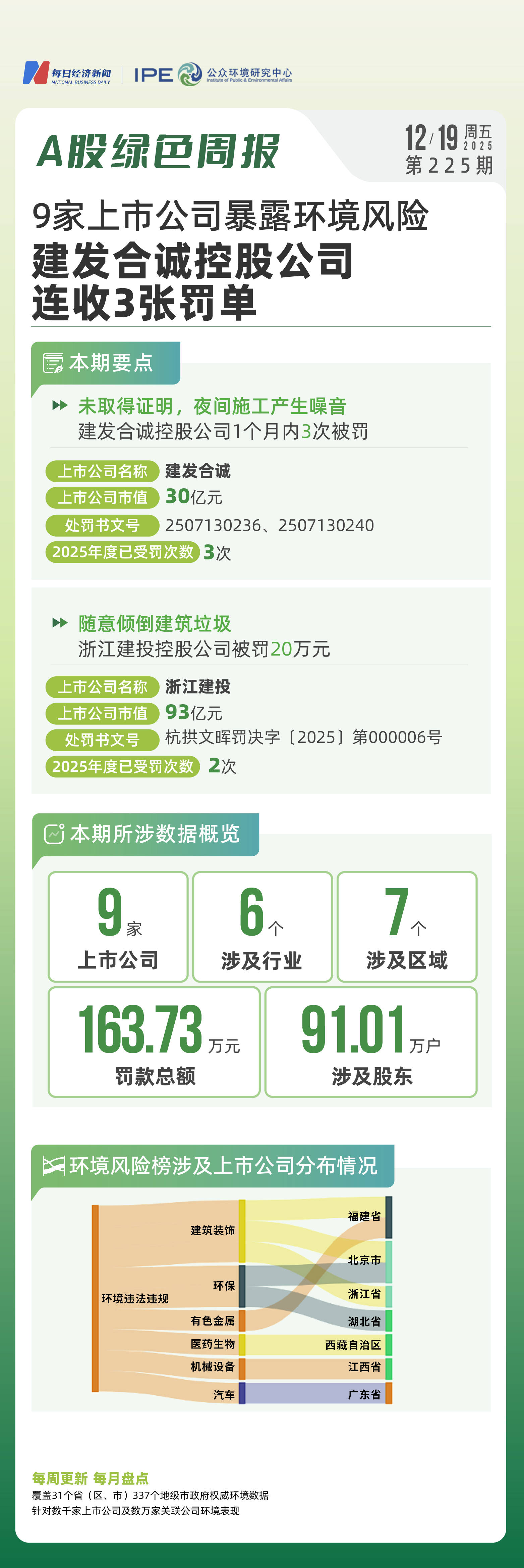2 公众环境研究中心 每日经济新闻 | ATIONAL BUSINESS DAILY A股缩空间报 9家上市公司暴露环境厂 建发合诚控股公司 连收3张罚直 富本期要点 未取得证明,夜间施工产生噪音 建发合诚控股公司1个月内3次被罚 建发合诚 上市公司名称 30亿元 上市公司市值 2507130236、250713024( 处罚书文号 2025年度已受罚次数 3次 随意倾倒建筑垃圾 浙江建投控股公司被罚20万元 浙江建投 上市公司名称 93亿元 上市公司市值 杭拱文晖罚决字〔2025〕第 处罚书文号 2025年度已受罚次数 2次 cj 本期所涉数据概览 家 上市公司 游及行业 未取得证明,在噪声敏感建筑物集中区域夜间施工产生噪音,建发合诚(SH603909)控股公司一个月内连收3张罚单;随意倾倒建筑垃圾,浙江建投 (SZ002761)控股公司被罚20万元⋯⋯ 2025年12月第三周,哪些上市公司的环境保护与信披责任亮起了红灯?且看A股绿色周报第225期。 每日经济新闻联合环保领域知名NGO公众环境研究中心(IPE),自2020年9月起,基于31个省份(自治区、直辖市)、337个地级市政府发布的环境质量、 环境排 ...
