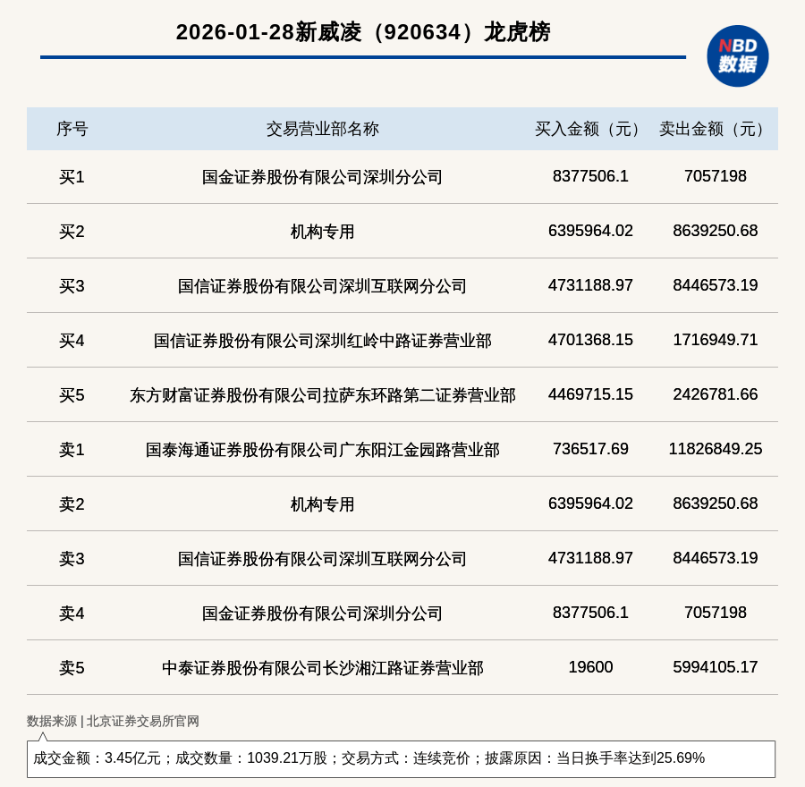 (记者 曾健辉) 每经讯,2026年1月28日,北交所上市公司新威凌(920634,收盘价:34.04元)登上龙虎榜,交易方式是连续竞价,披露原因是 当日换手率达到25.69%,成交数量1039.21万股,成交金额3.45亿元。买一席位为国金证券股份有限公司深圳分公司,买入 837.75万元;卖一席位为国泰海通证券股份有限公司广东阳江金园路营业部,卖出1182.68万元。 | | 2026-01-28新威凌 (920634) 龙虎榜 | | | | --- | --- | --- | --- | | 序号 | 交易营业部名称 | 买入金额(元) | 卖出金额(元) | | ਜੇਨ ਹ | 国金证券股份有限公司深圳分公司 | 8377506.1 | 7057198 | | 买2 | 机构专用 | 6395964.02 | 8639250.68 | | न्ने३ | 国信证券股份有限公司深圳互联网分公司 | 4731188.97 | 8446573.19 | | 买4 | 国信证券股份有限公司深圳红岭中路证券营业部 | 4701368.15 | 1716949.71 | | નેર | 东方财富证券股份有限公司 ...