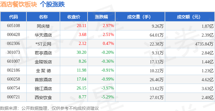 证券之星消息,2月2日酒店餐饮板块较上一交易日下跌1.72%,西安饮食领跌。当日上证指数报收于 4015.75,下跌2.48%。深证成指报收于13824.35,下跌2.69%。酒店餐饮板块个股涨跌见下表: | 代码 | 名称 | 收盘价 | 涨跌幅 | 成交量(手) | 成交额(元) | | --- | --- | --- | --- | --- | --- | | 605108 | 同庆楼 | 20.11 | 2.97% | 9.26万 | 1.87亿 | | 000428 | 华天酒店 | 3.68 | 2.51% | 64.01万 | 2.39 Z | | 002306 | *ST云网 | 2.12 | 0.47% | 22.38万 | 4735.84万 | | 301073 | 君喜酒店 | 30.20 | -0.20% | 9.31万 | 2.84亿 | | 601007 | 金陵饭店 | 8.26 | -0.36% | 17.13万 | 1.44亿 | | 002186 | 全聚德 | 11.98 | -0.91% | 10.22万 | 1.23亿 | | 600258 | 首旅酒店 | 17.0 ...