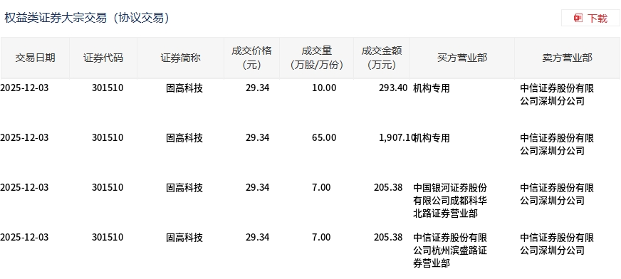 | 交易日期 | 证券代码 | 证券简称 | 成交价格 | 成交量 | 成交全额 | 买方营业部 | 卖方营业部 | | --- | --- | --- | --- | --- | --- | --- | --- | | | | | (元) | (万股/万份) | (万元) | | | | 2025-12-03 | 301510 | 固高科技 | 29.34 | 10.00 | 293.40 机构专用 | | 中信证券股份有限 | | | | | | | | | 公司深圳分公司 | | 2025-12-03 | 301510 | 固高科技 | 29.34 | 65.00 | 1,907.1 机构专用 | | 中信证券股份有限 | | | | | | | | | 公司深圳分公司 | | 2025-12-03 | 301510 | 固高科技 | 29.34 | 7.00 | 205.38 中国银河证券股份 | | 中信证券股份有限 | | | | | | | 有限公司成都科华 | | 公司深圳分公司 | | | | | | | 北路证券营业部 | | | | 2025-12-03 | 301510 | 固高科技 ...