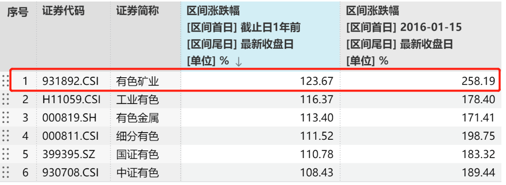 | 序号 证券代码 | 证券简称 | 区间涨跌幅 | 区间涨跌幅 | | | --- | --- | --- | --- | --- | | | | [区间首日] 截止日1年前 | [区间首日]2016-01-15 | | | | | [区间尾日] 最新收盘日 | [区间尾日] 最新収盘日 | | | | | [単位] % ↓ | [单位] % | | | 1 931892.CSI 有色矿业 | | | 123.67 | 258.19 | | 2 H11059.CSI 工业有色 | | | 116.37 | 178.40 | | 3 000819.SH 有色金属 | | | 113.40 : | 171.41 | | 4 000811.CSI 细分有色 | | | 111.52 | 198.75 | | 5 399395.SZ 国证有色 | | | 110.78 : | 183.32 | | 6 930708.CSI 中证有色 | | | 108.43 | 189.44 | 来源:Wind,截至2026.1.15 【免责声明】本文仅代表作者本人观点,与和讯网无关。和讯网站对文中陈述、观点判断保持中立,不对所包 ...