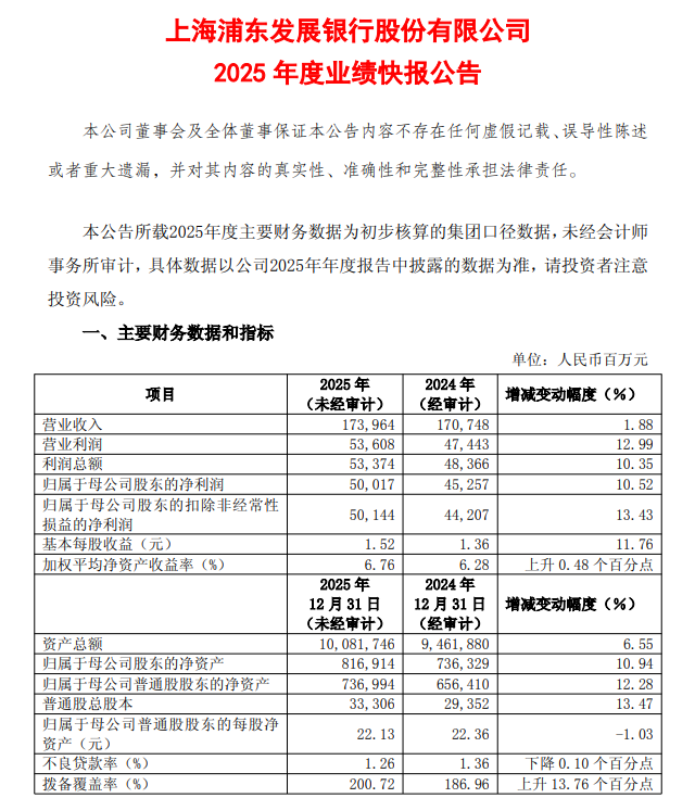 浦发银行2025年净利增长10.52% 资产规模突破10万亿