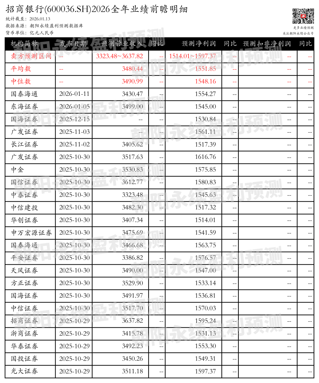 1. 招商银行全年业绩预期怎么样? 截至2026年01月13日,根据朝阳永续季度业绩前瞻数据: 预测营业收入3323.48~3637.82亿元; 预测净利润1514.01~1597.37亿元。 关注后续财报数据披露后能否超预期,朝阳永续A股季度业绩前瞻数据将为投资者提供业绩鉴定。 东海证券认为:招商银行在行业下行周期中保持领先优势,主要经营指标稳健,ROE与股息率较高。规模增速适度放缓,资产负债表审慎扩张,优化零 售、对公与金融投资占比。息差绝对优势稳固,下行压力放缓,预计2026年高成本中长期存款到期重定价将减缓息差下行。资产质量审慎管理,对公房地 产风险暴露充分,零售风险上升斜率有望放缓。中间业务经历底部震荡后,财富管理业务有望重回业绩核心。股东回报方面,分红比例稳居行业第一梯 队,资本内生能力强。预计2025-2027年营业收入和归母净利润稳步增长,当前估值处于历史低位,具备投资价值。 分业务来说: 1)规模增速:招商银行规模增速随行业适度放缓,资产负债表审慎扩张,优化业务占比寻求规模增长与风险平衡。 2)息差优势:招商银行净息差绝对值具备显著护城河,预计2026年下行压力减缓。 3)资产质量:招商银行 ...
