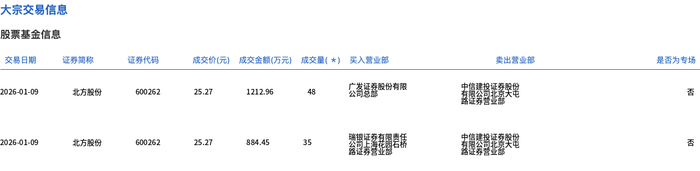 | 交易日期 | 证券調称 | 证券代码 | 成交价(元) 成交金额(万元) 成交量(*) 买入营业部 | | | 类出管业部 | 是否为专场 | | --- | --- | --- | --- | --- | --- | --- | --- | | 2026-01-09 | 北方般份 | 600262 25.27 | 1212.96 48 | 厂发证券股份有限 | 新品牌 | | Ka | | 2026-01-09 | 北方股份 | 600262 25.27 | 884.45 3 हे | 2012 2018 11:22 | 草原花园酒店酒店 | | Ka | 1月9日,北方股份大宗交易成交83万股,成交额2097.41万元,占当日总成交额的14.69%,成交价25.27 元,较市场收盘价27.97元折价9.65%。 ...