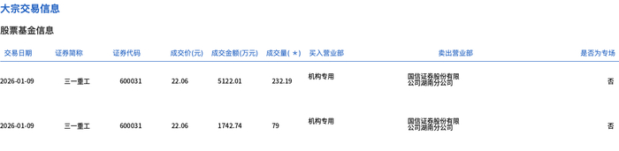 | 交易日期 | 证券简称 | 证券代码 | | 成交价(元) 成交金额(万元) 成交量(*) 买入营业部 | | | 类出管业部 | 是否为专场 | | --- | --- | --- | --- | --- | --- | --- | --- | --- | | 2026-01-09 | ==== | 600031 | 5122.01 22,06 | 232.19 | 机构专用 | 圆筒清素男公费气 | | Ka | | 2026-01-09 | 三一重工 | 600031 | 22.06 1742.74 | 79 | 机构专用 | 圆筒플常勞纹盘眼 | | Ka | 1月9日,三一重工大宗交易成交311.19万股,成交额6864.75万元,占当日总成交额的2.73%,成交价 22.06元,较市场收盘价22.28元折价0.99%。 ...