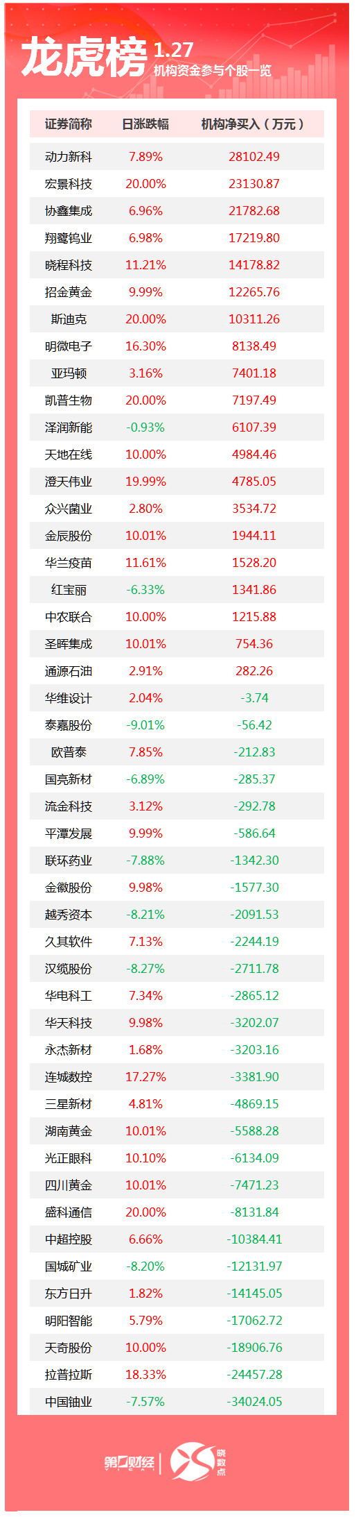 当天机构净卖出前三的股票分别是中国铀业、拉普拉斯、天奇股份,净流出金额分别是3.4亿元、2.45亿 元、1.89亿元。 | 17 元元 | 机构资金参与个股一 | | | --- | --- | --- | | 证券简称 | 日涨跌幅 | 机构净买入(万元) | | 动力新科 | 7.89% | 28102.49 | | 宏景科技 | 20.00% | 23130.87 | | 协鑫集成 | 6.96% | 21782.68 | | 翔鹭钨业 | 6.98% | 17219.80 | | 晓程科技 | 11.21% | 14178.82 | | 招金黄金 | 9.99% | 12265.76 | | 斯迪克 | 20.00% | 10311.26 | | 明微电子 | 16.30% | 8138.49 | | 亚玛顿 | 3.16% | 7401.18 | | 凯普生物 | 20.00% | 7197.49 | | 泽润新能 | -0.93% | 6107.39 | | 天地在线 | 10.00% | 4984.46 | | 澄天伟业 | 19.99% | 4785.05 | | 六兴菌业 | 2.80% | ...