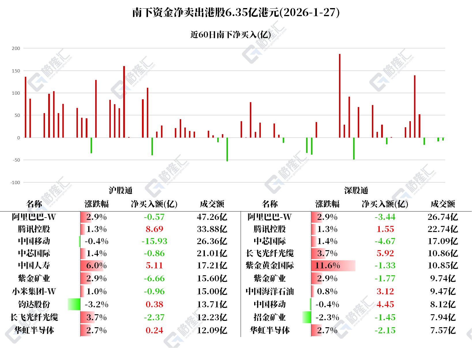 净买入腾讯控股10.24亿、中国人寿5.11亿、长飞光纤光缆3.54亿、中国海洋石油3.12亿; 净卖出中国移动11.47亿、紫金矿业8.42亿、中芯国际5.52亿、阿里巴巴-W 4.01亿、华虹半导体1.91亿、招金矿业1.45亿、紫金黄金国际1.33亿。 格隆汇1月27日|南下资金今日净卖出港股6.35亿港元,为连续第三日净卖出。其中: | | 沖股通 | | | | | --- | --- | --- | --- | --- | | 名称 | 涨跌幅 | 净买入额(亿) | 成交额 | 名称 | | 阿里巴巴-W | 2.9% | -0.57 | 47.26 Z | 阿里巴巴-W | | 腾讯控股 | 1.3% | 8.69 | 33.88 Z | 腾讯控股 | | 中国移动 | -0.4% | -15.93 | 26.36 Z | 中心国际 | | 中芯国际 | 1.4% | -0.86 | 21.01亿 | 长飞光纤光缆 | | 中国人寿 | 6.0% | 5.11 | 17.21亿 | 紫金黄金国际 | | 紫金矿业 | 2.9% | -6.66 | 15.60 Z | 紫尖则,亦 | | 小米集 ...