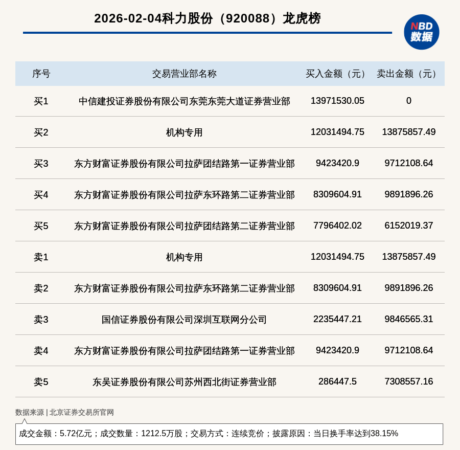 每经讯,2026年2月4日,北交所上市公司科力股份(920088,收盘价:46.87元)登上龙虎榜,交易方式是连续竞价,披露原因 是当日换手率达到38.15%,成交数量1212.5万股,成交金额5.72亿元。买一席位为中信建投证券股份有限公司东莞东莞大道证券 营业部,买入1397.15万元;卖一席位为机构专用,卖出1387.59万元。 | | 2026-02-04科力股份 (920088) 龙虎榜 | | | | --- | --- | --- | --- | | 序号 | 交易营业部名称 | 买入金额(元) | 卖出金额(元) | | न्द्र ग | 中信建投证券股份有限公司东莞东莞大道证券营业部 | 13971530.05 | 0 | | 址2 | 机构专用 | 12031494.75 | 13875857 49 | | ग्रेउ | 东方财富证券股份有限公司拉萨团结路第一 一证券营业部 | 9423420.9 | 9712108.64 | | नेटर | 东方财富证券股份有限公司拉萨东环路第二证券营业部 | 8309604.91 | 9891896.26 | | ન્નેર | 东方财富证券股份 ...