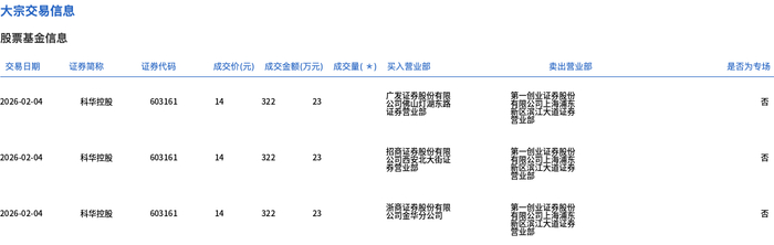2月4日,科华控股大宗交易成交69万股,成交额966万元,占当日总成交额的6.4%,成交价14元,较市 场收盘价15.95元折价12.23%。 | 交易日期 | 证券简称 | 证券代码 | | | 成交价(元) 成交金额(万元) 成交量(*) 买入营业部 | | 类出营业部 | 是否为专场 | | --- | --- | --- | --- | --- | --- | --- | --- | --- | | 2026-02-04 | 科学控股 | 603161 | 14 | 322 | 23 | 参考资料 浏览器 | 第一副不成分图书 | Ka | | 2026-02-04 | 科华控股 | 603161 | 14 | 322 | 23 | 图片表示关注感 | 第一刻書平香屋堂 | KI | | 2026-02-04 | 科华拉服 | 603161 | 14 | 322 | 23 | 类副是零务效高限 | 第一创业证券股份 | Ka | ...