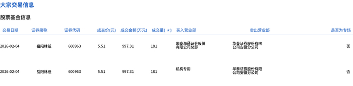| 交易日期 | 证券简称 | 证券代码 | 成交价(元) 成交金额(万元) 成交量(*) 买入营业部 | | | 类出营业部 | 是否为专场 | | --- | --- | --- | --- | --- | --- | --- | --- | | 2026-02-04 | 岳阳林纸 | 600963 | ਦੇ ਦੇ I 997.31 181 | 用香港清廷發驗份 | 芸需要盘男公周照 | | Ka | | 2026-02-04 | 岳阳林经 | 600963 | 5.51 997.31 181 | 机构专用 | 去壽宴蘊劈绞君■ | | | | | | | | | | | Ka | 2月4日,岳阳林纸大宗交易成交362万股,成交额1994.62万元,占当日总成交额的3.83%,成交价5.51 元,较市场收盘价6.15元折价10.41%。 ...