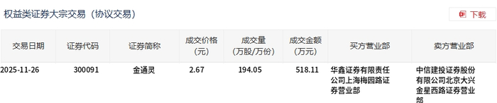 | 交易日期 | 证券代码 | 证券简称 | 成交价格 | 成交量 | 成交金额 (万元) | 买方营业部 | 卖方营业部 | | --- | --- | --- | --- | --- | --- | --- | --- | | | | | (元) | (万股/万份) | | | | | 2025-11-26 | 300091 | 金通灵 | 2.67 | 194.05 | 518.11 | 华鑫证券有限责任 | 中信建投证券股份 | | | | | | | | 公司上海梅园路证 | 有限公司北京大兴 | | | | | | | | 券营业部 | 金星西路证券营业 | | | | | | | | | ਜੋ | 11月26日,金通灵大宗交易成交194.05万股,成交额518.11万元,占当日总成交额的5.41%,成交价2.67 元,较市场收盘价2.96元折价9.8%。 ...